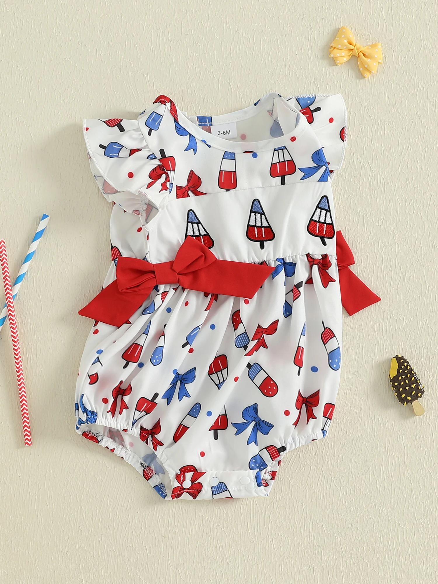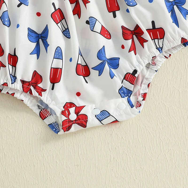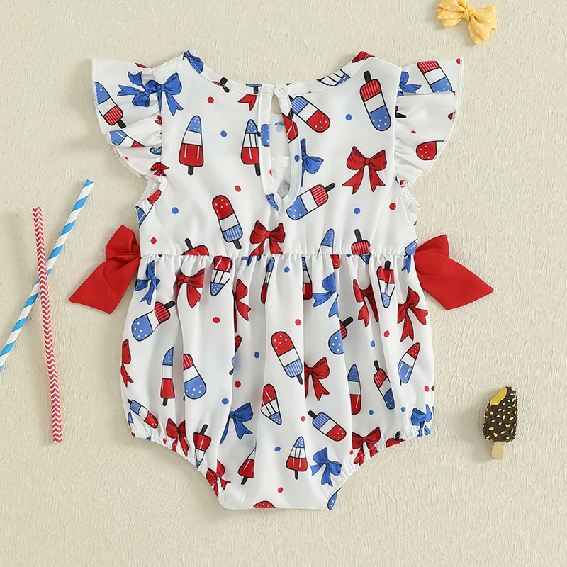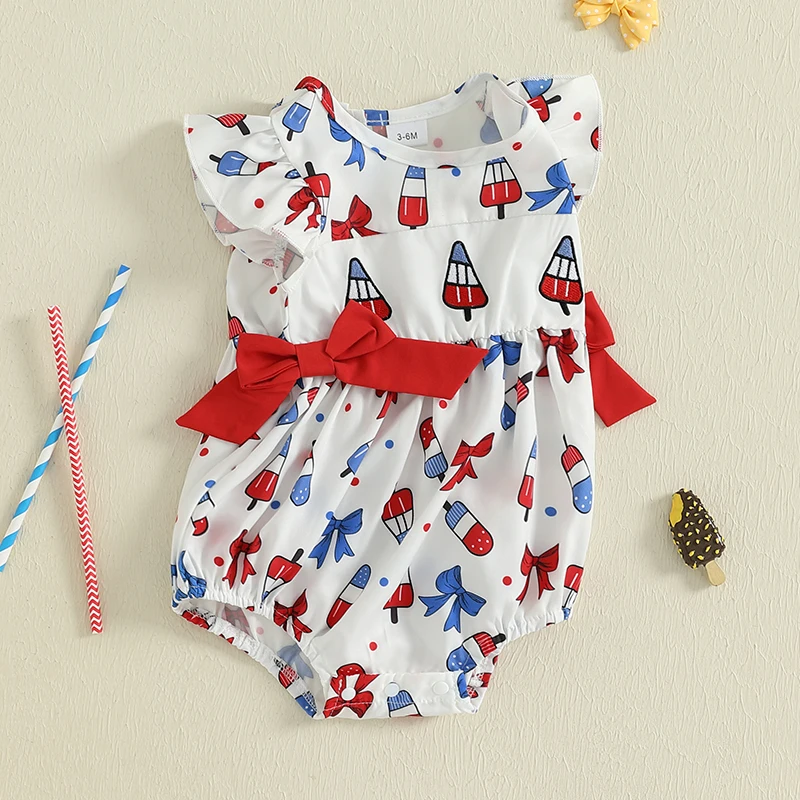 Baby Girl 4th of July Romper Flying Sleeve Round Neck Ice Cream Printed Bow Bodysuit