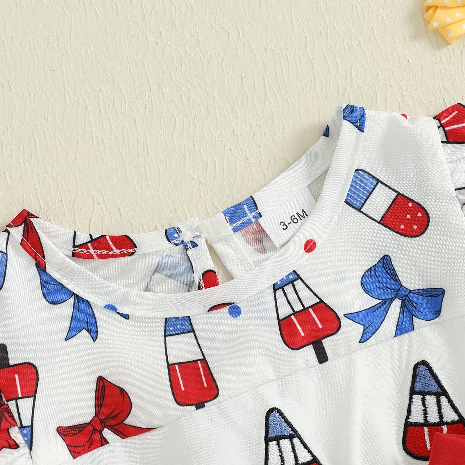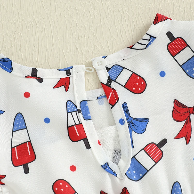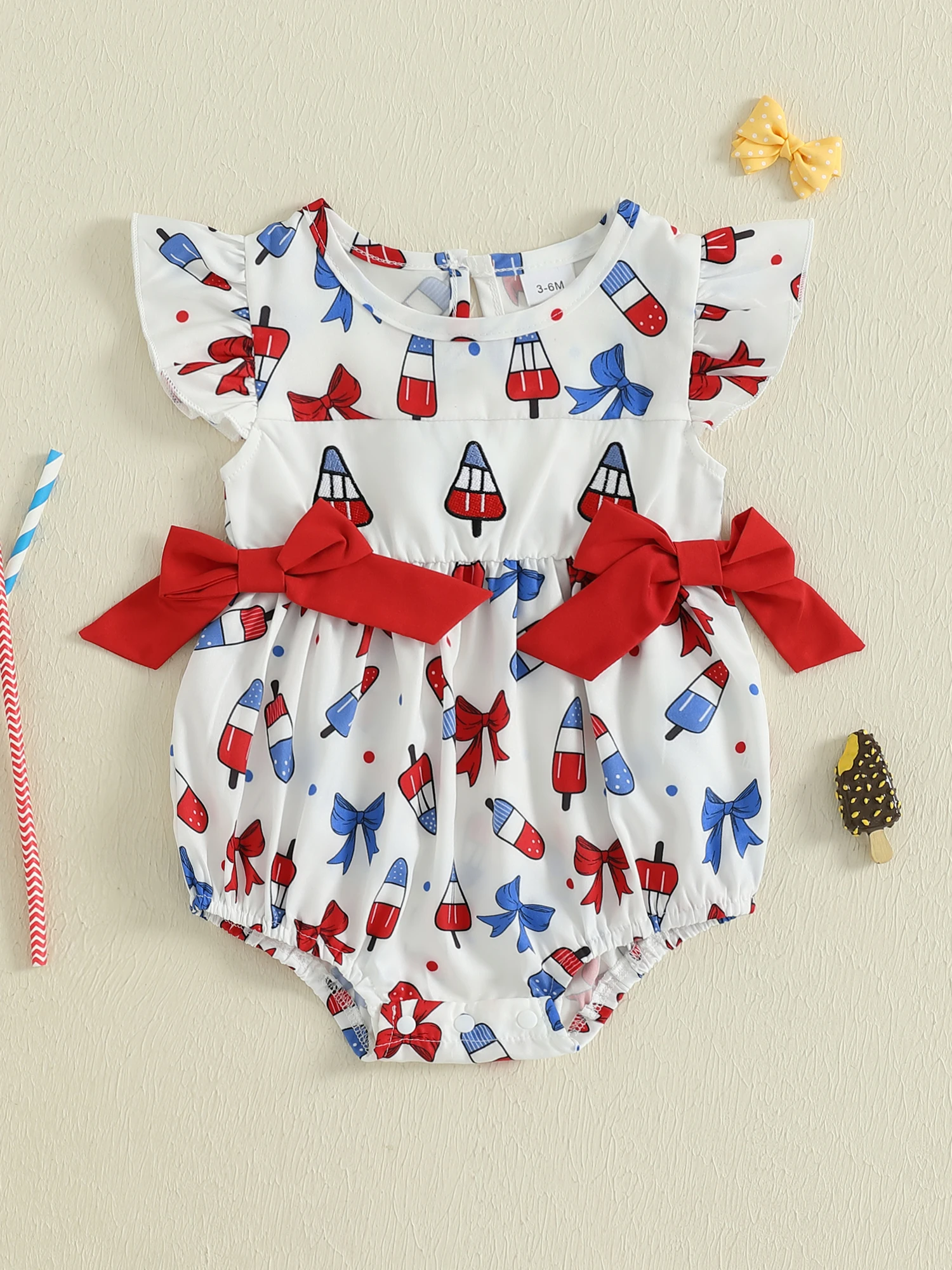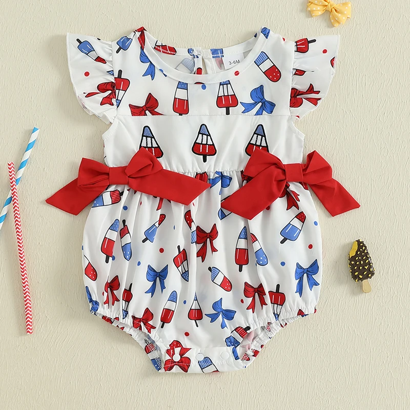 Baby Girl 4th of July Romper Flying Sleeve Round Neck Ice Cream Printed Bow Bodysuit
