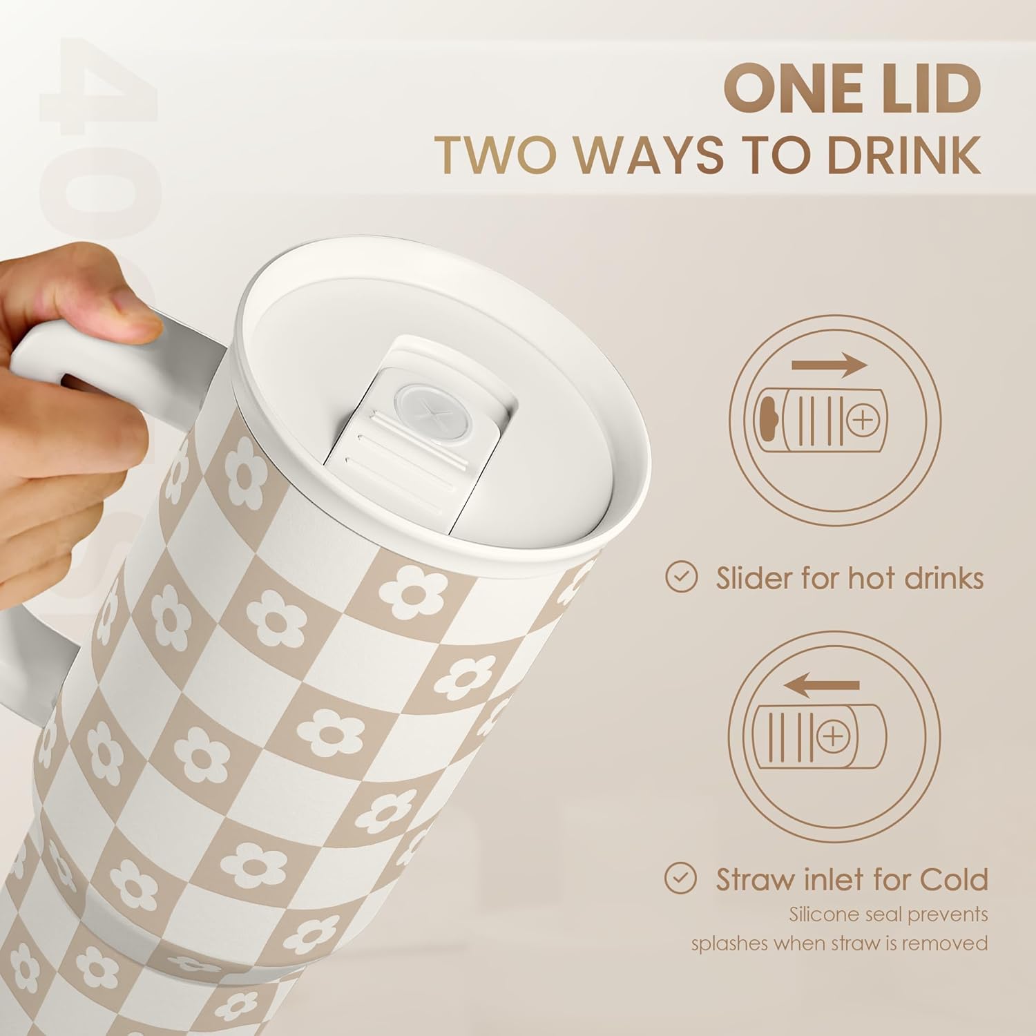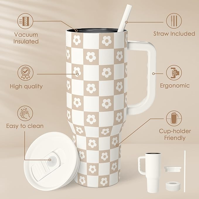 Checker Tumbler with Handle and Straw 40oz – Stainless Sleel Slider Tumbler Travel Coffee Mug for Women - Gift Idea for Birthday Christmas