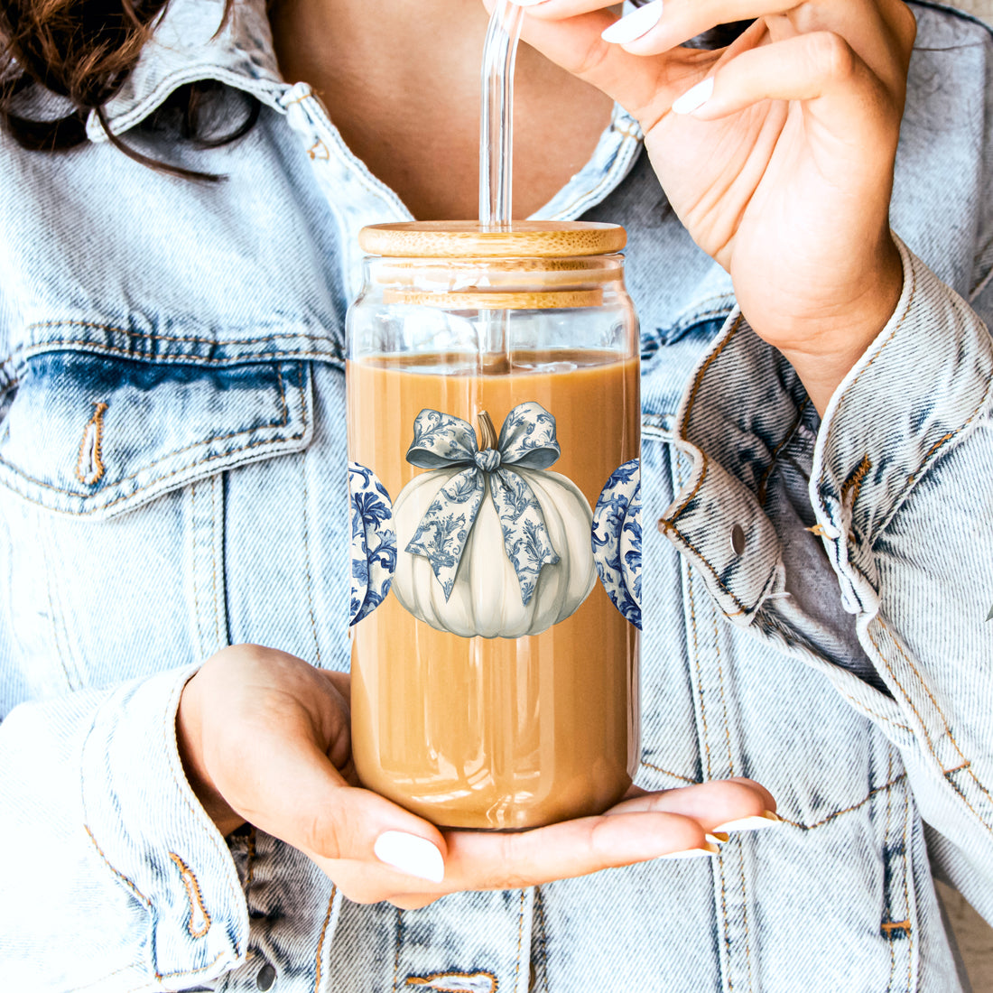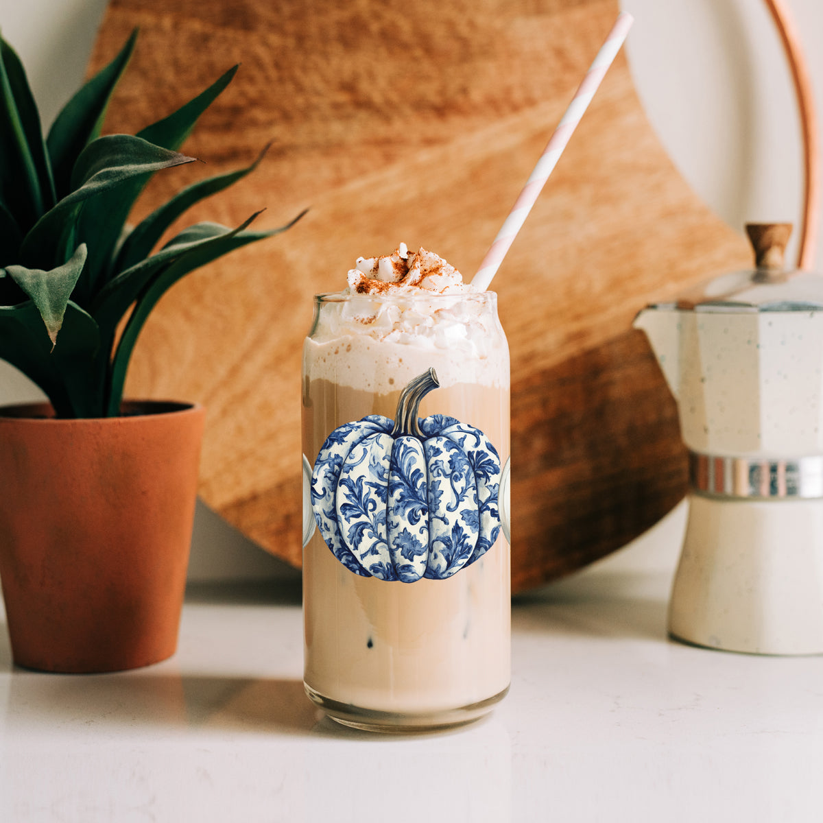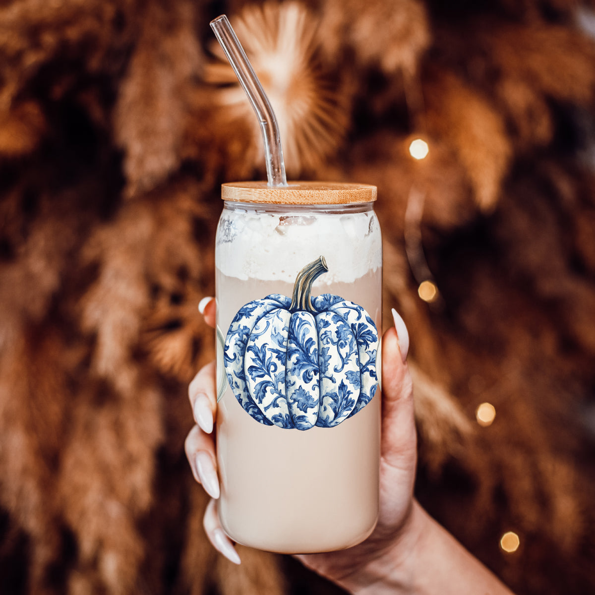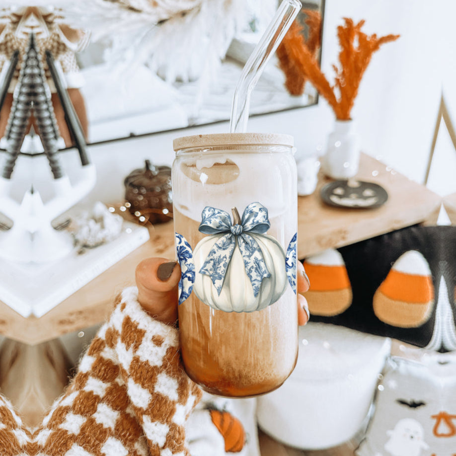 Introducing our most sophisticated fall collection yet - because why have one gorgeous Chinoiserie pumpkin when you can have two styles? These 20oz glass tumblers feature alternating blue chinoiserie and white Chinoiserie ribbon pumpkins that make basic fall decor look positively ordinary!