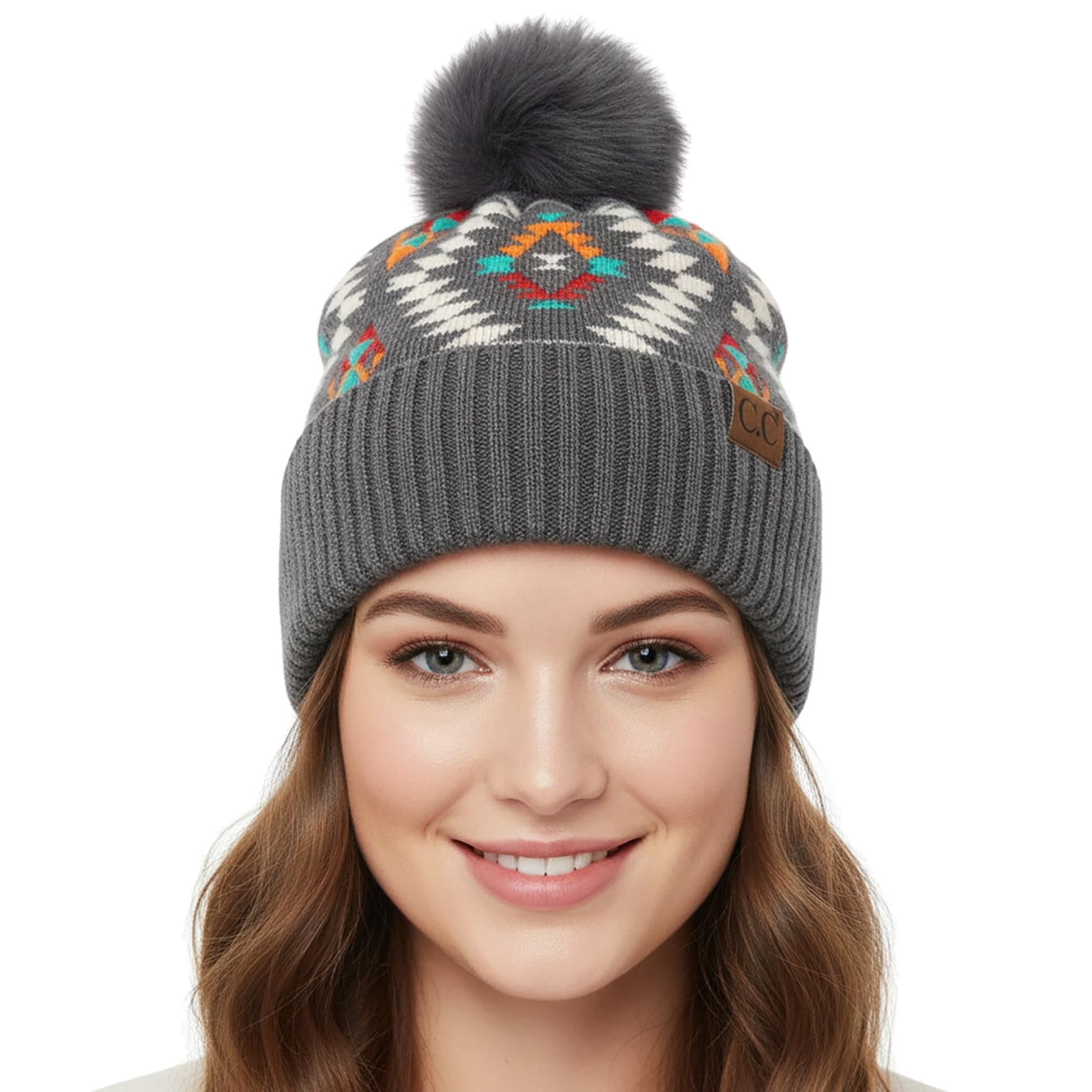 C.C Soft Aztec Pattern Beanie with Faux Fur Pom