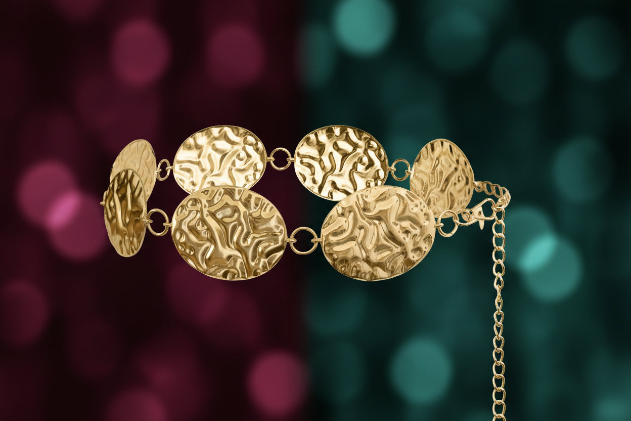 - Western-Inspired Gold Concho Chain Belt: Make a bold style statement with this western concho belt featuring oversized hammered gold-tone conchos connected by chain links—perfect for cowgirl and country concert outfits.