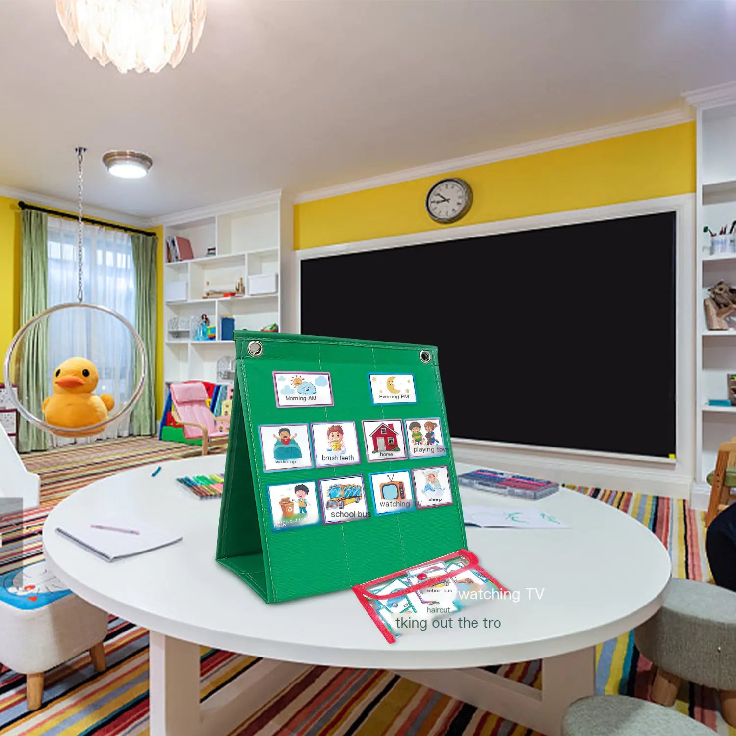 - Standing and Hanging: One is it can hang on the wall or other places as a kid's visual schedule chart to use, another is it can be stand on the table as a felt teaching board to use. The schedule holder is durable, compact, and lightweight. It's a portable schedule that helps your students stay on track for their day and reduces confusion.