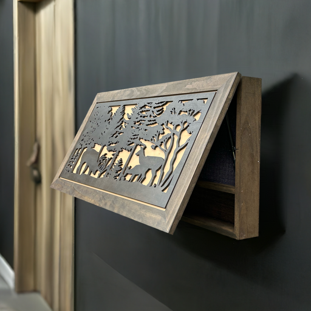 - HANDMADE WOOD GUN SAFE: Skillfully built by a family of artisans to combine art and functionality, this hidden wall gun cabinet is hand-crafted from premium wood and a laser cut Deer In The Woods design. Designed to last and made to impress, its hidden gun storage wall decor with purpose — and reliable gun hidden storage you can count on. Dimensions: 39L x 19”T x 4"D