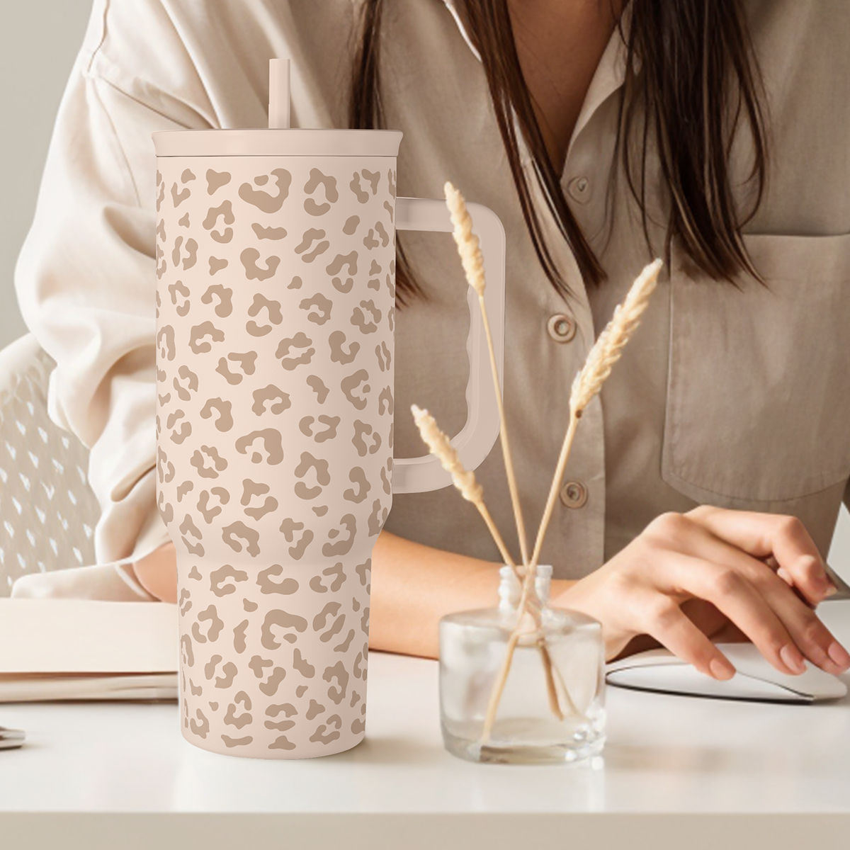 Leopard Tumbler with Handle, Insulated Cup Stainless Steel Travel Mug Cup, Gifts for Women Girl on Birthday Christmas, Tan Leopard, 40oz