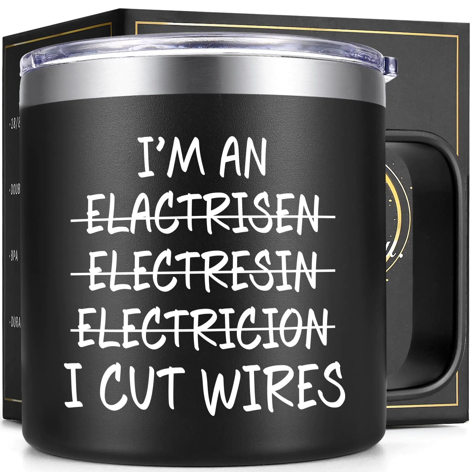 ["Wonderful Electrician Gifts for Men: Are you looking for enchanting and thoughtful electrician gifts? Look no further. Our “Im An Electrician I Cut Wires” 14oz coffee mug serves as a unique electrician gift for men suitable for occasions like Birthday Christmas and Thanksgiving" Double Wall Vacuum Insulation: The electrician gifts feature the double-wall insulation technology designed to maintain your favorite beverage’s temperature for up to 10 hours cold and 4 hours hot. No matter your preference hot or cold it ensures your drink stays at the ideal temperature Premium Material: The electrician gifts for men are crafted from food-grade 304 stainless steel making it unbreakable and sweat-proof. Moreover this high-quality material ensures each sip preserves the original taste and flavor Enjoy Your Favorite Drinks: This gift for electricians men 14oz coffee mug is perfect for water wine coffee champagne milk tea. Also it can be used home office travel camping swimming gym and other outdoor and indoor places. Enjoy your favorite drinks with friends and family Package Included: To enhance your enjoyment of favorite beverages and to express your appreciation for electricians our electrician gift for men 14oz insulated coffee mug comes with a complete set of accessories. Each coffee mug includes 1 lid 1 stainless steel straw 1 straw brush and 1 cup brush for your convenience]