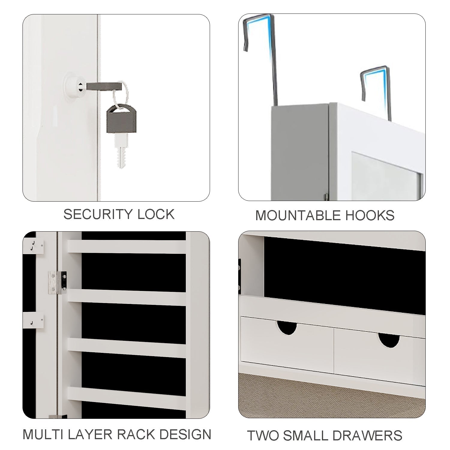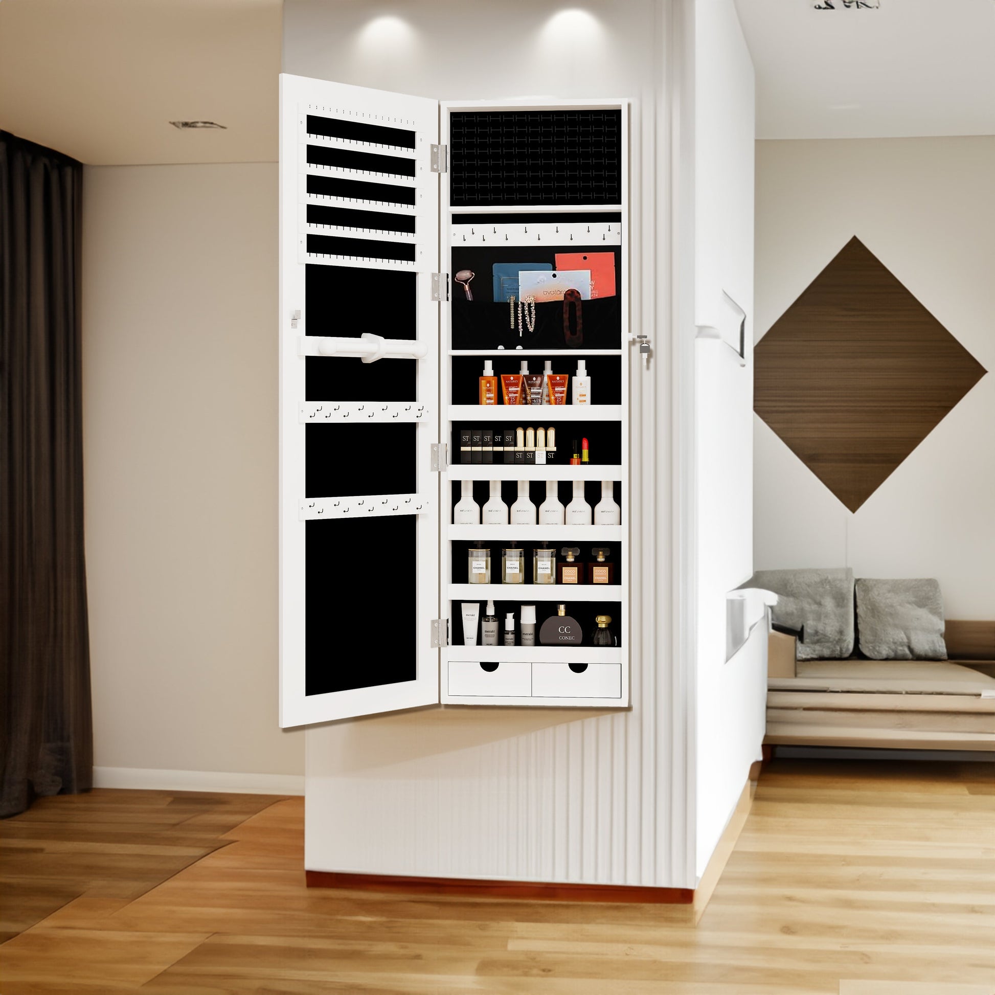 Lockable and Practical:this jewelry mirror cabinet comes with a lock and 2 keys to keep children out and prevent unwanted opening.