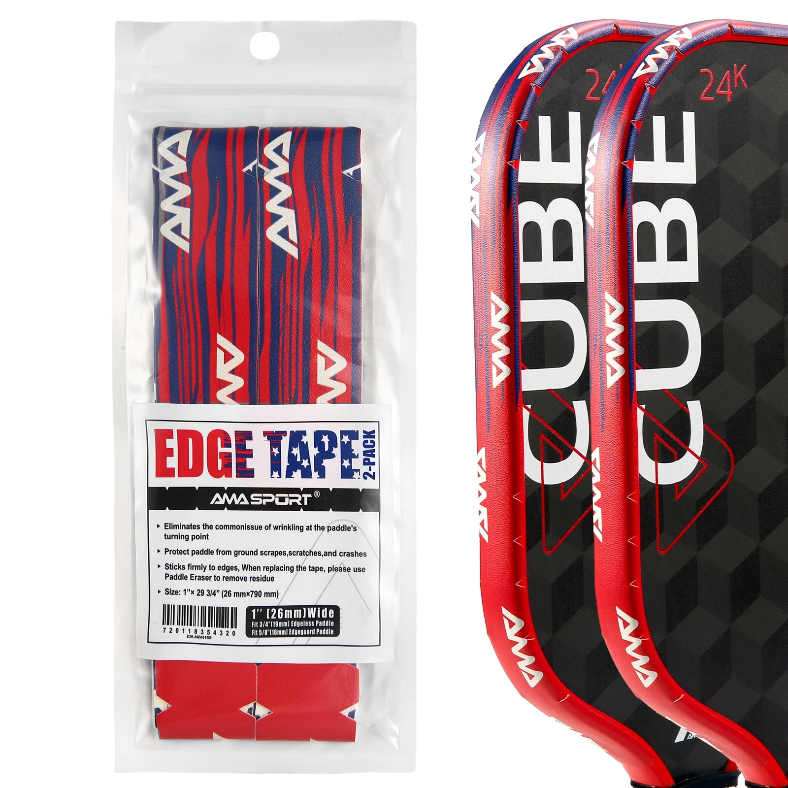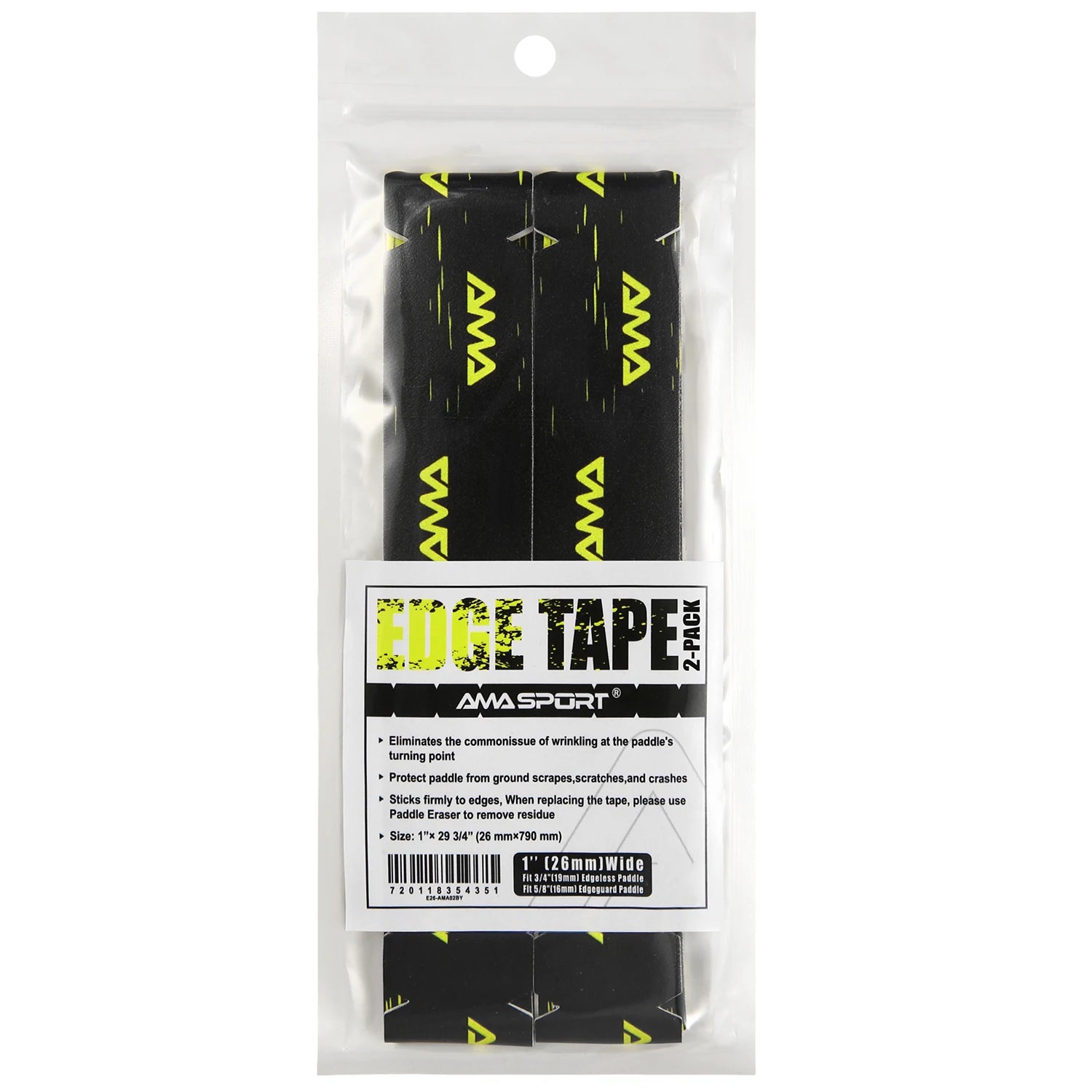 20mm (5/8"), 23mm (3/4"), 26mm (1") WIDTHS FOR VARIOUS PADDLE THICKNESSES - 20mm (5/8") tape for 13mm (1/2") Thickness Edgeless Paddle. 23mm (3/4") tape for 13mm (1/2") Thickness Edge guard Paddle and 16mm (5/8") Thickness Edgeless Paddle. 26mm (1") tape for 16mm (5/8") Thickness Edge guard Paddle and 19mm (3/4") Thickness Edgeless Paddle.
