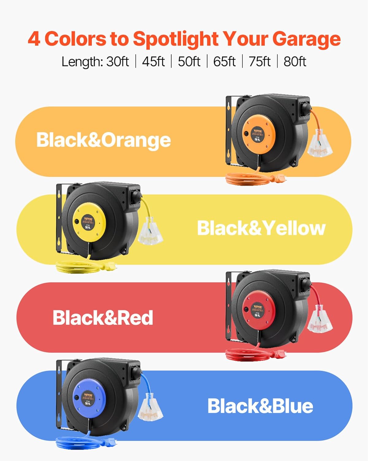 - Apply in Multiple Scenarios: Are you tired of your cords not reaching? Well, get the job done effortlessly with the VEVOR retractable cord reel. It is convenient for long-distance use, meeting your power needs, and suitable for DIY, commercial and industrial applications. For example, garages, shops, construction sites, courtyards, and homes. Ideal for power tools like circular saws, drills, work lights, etc.