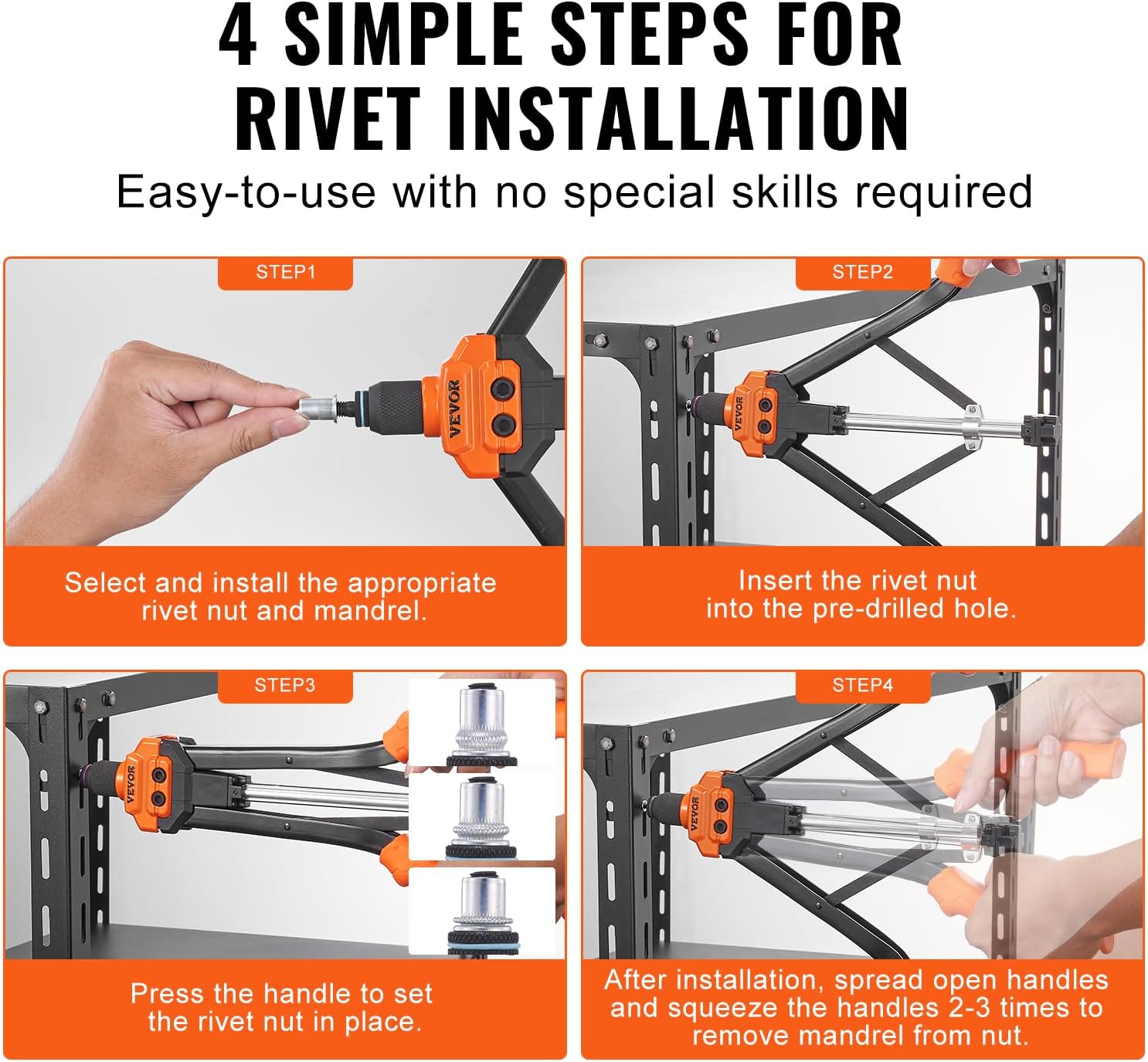 - Semi-Auto De-Riveting for Efficiency: VEVOR 16-inch rivet nut tool features a connecting rod semi-automatic de-riveting design. Just open and close 2-3 times, and it automatically releases the rivet. The 16-inch long handle provides optimal leverage, making it the most efficient and time-saving manual rivet gun. It boosts your work efficiency and makes riveting effortless.